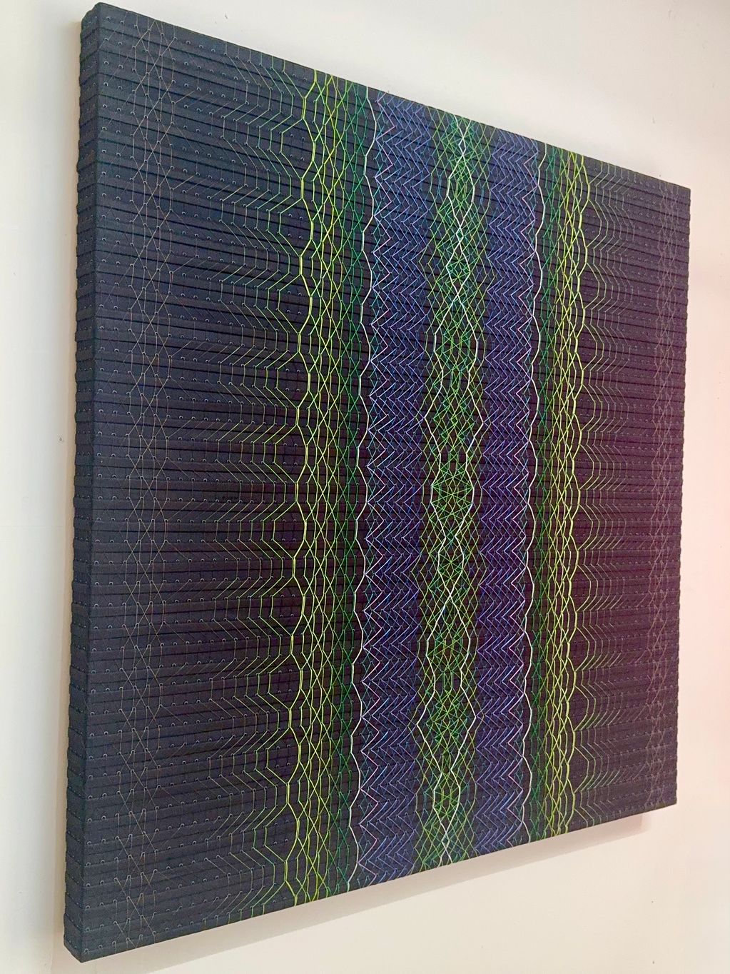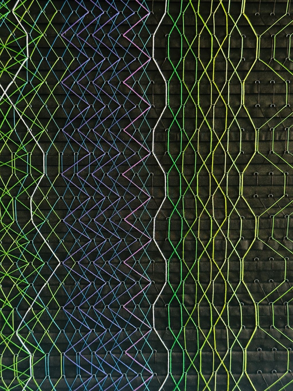 The Fiber Field Series are abstract works rooted in fiber, textiles, and thread. Using a variety of fabrics and stitching techniques, my pieces unfold as large fields of color, marked by intricate thread patterns and detailed stitch work.